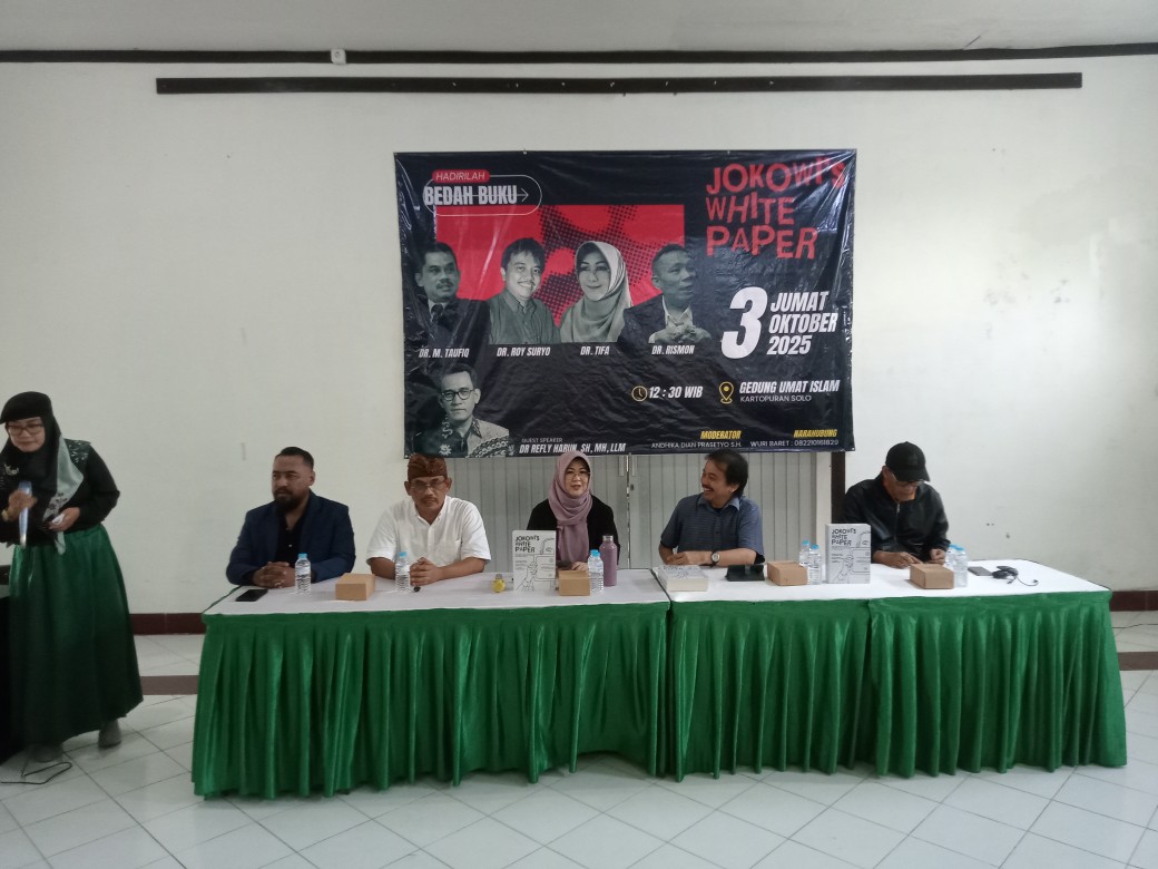 INDONNESIANEWS (Solo)–Roy Suryo bersama dr. Tifa, Dr Refli Harun dan M. Taufik, hadir sebagai pembicaraan dalam acara bedah buku berjudul Jokowi’s White Paper, di gedung Umat Islam, Kartopuran, Jum’at (3-10-2025) lalu. Ratusan peserta dari Solo hadir di acara tersebut.
