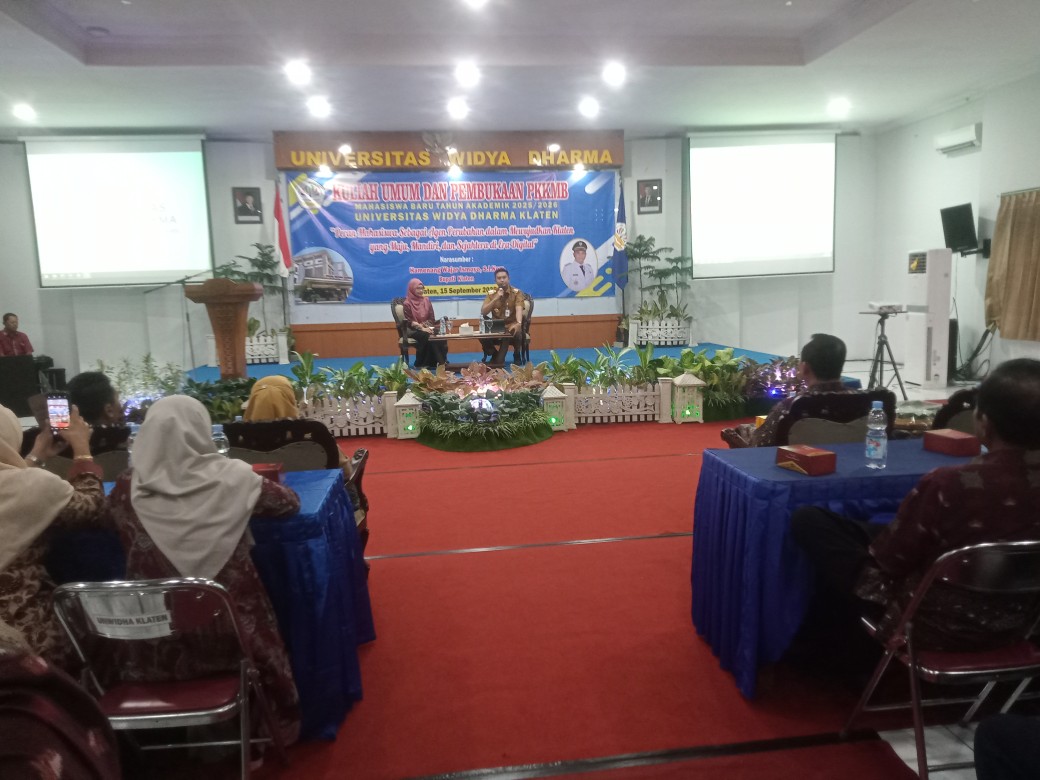 INDONNESIANEWS (Klaten)–Bupati Klaten, Hamenang Wajar Ismoyo, memberikan kuliah umum dalam rangka Pengenalan Kehidupan Kampus Mahasiswa Baru (PKKMB) bagi 415 mahasiswa baru tahun akademik 2025/2026 di Universitas Widya Dharma (Unwidha) Klaten. Acara ini berlangsung di auditorium lantai 2 gedung Unwidha, Macanan, Klaten Utara, Klaten, Senin (15-9-2025).