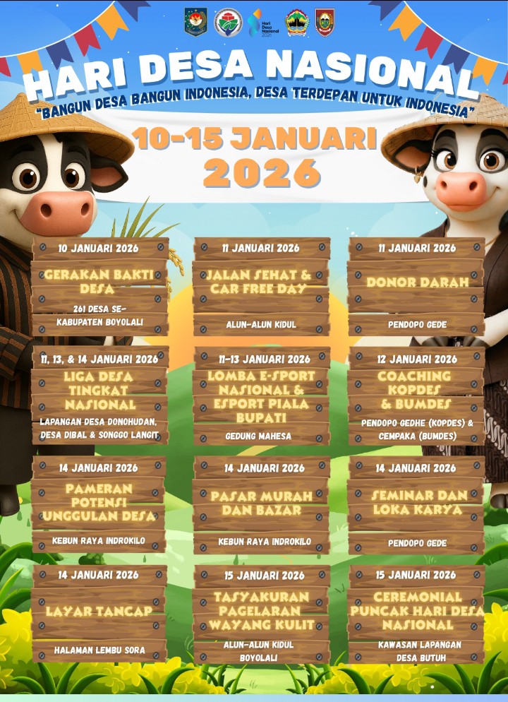 INDONNESIANEWS (Boyolali)–Pemerintah Kabupaten Boyolali, Jawa Tengah, akan menjadi tuan rumah peringatan Hari Desa Nasional, yang akan digelar Sabtu-Kamis (10-15/1-2026) mendatang. Selama perhelatan berlangsung dengan diikuti perwakilan seluruh desa di tanah air itu akan ada 12 event yang tersebar diberbagai lokasi di wilayah Kabupaten Boyolali.