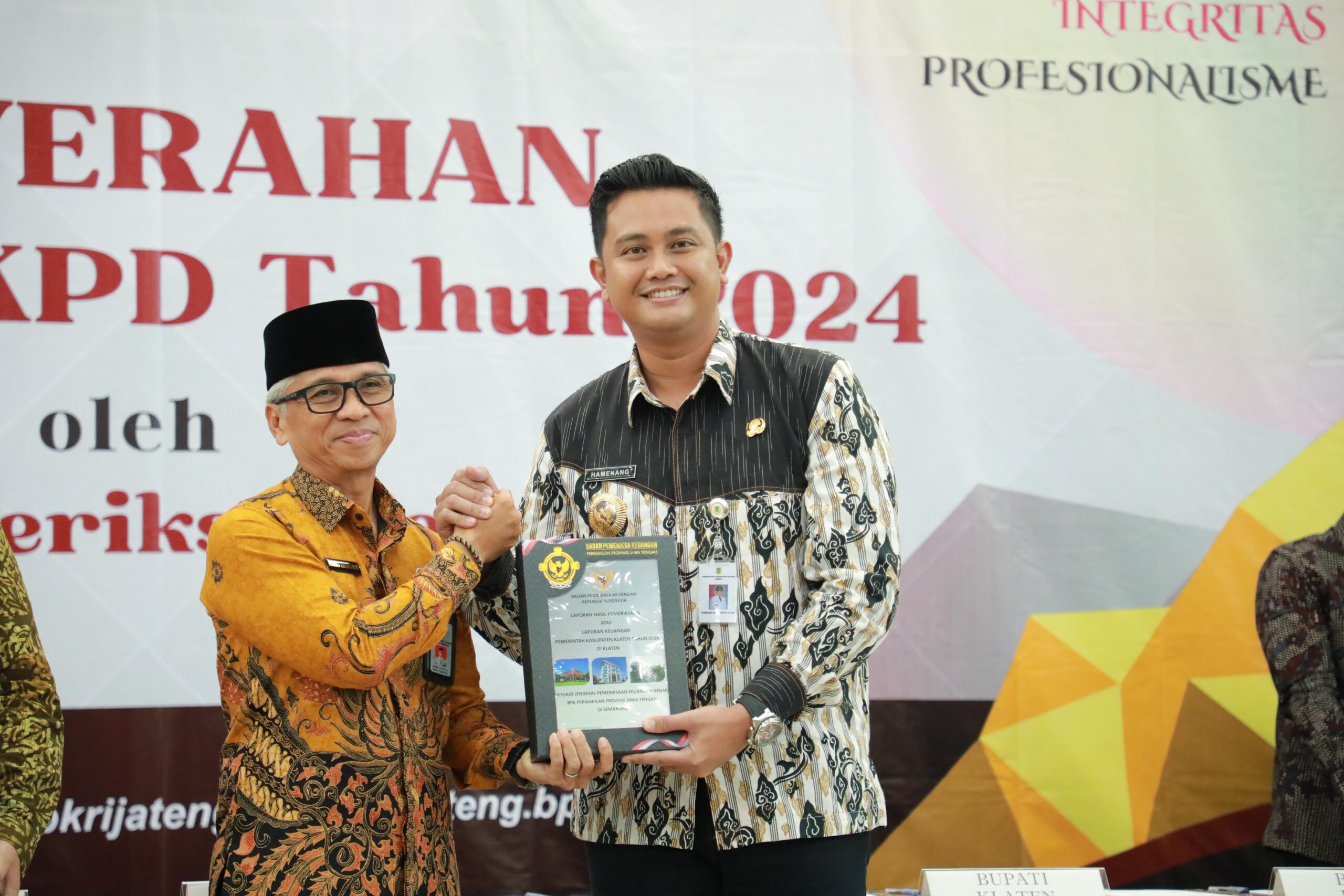 Kepala Perwakilan Badan Pemeriksa Keuangan Republik Indonesia (BPK RI) Provinsi Jawa Tengah,Ahmad Luthfi H. Rahmatullah, menyerahkan secara langsung Laporan Hasil Pemeriksaan (LHP) atas Laporan Keuangan Pemerintah Daerah (LKPD) Kabupaten Klaten tahun anggaran 2024 kepada Bupati Klaten, Hamenang Wajar Ismoyo di Kantor BPK RI Jateng, Kamis (05/06/2025).