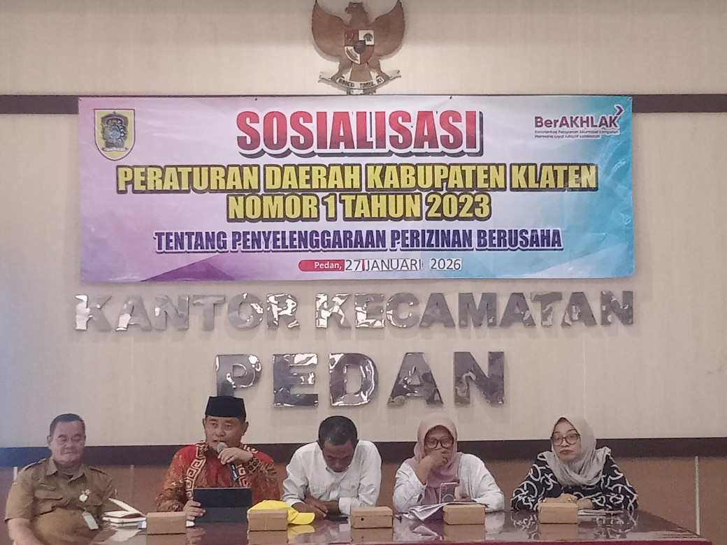 INDONNESIANEWS (Klaten)–Ketua DPRD Klaten, Adi Sasongko, berharap Perda no 1 tahun 2023 tentang Penyelenggaraan Perizinan Berusaha (NIB) bisa menjadi pegangan atau kepastian hukum bagi penyelenggara perizinan terutama pemerintah dan juga kemudahan perizinan bagi masyarakat maupun investor di kabupaten Klaten. Hal itu disampaikan saat berbicara di acara Sosperda tersebut di ruang pertemuan kecamatan Pedan, Klaten, Selasa (27-1-2026).